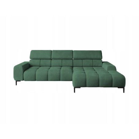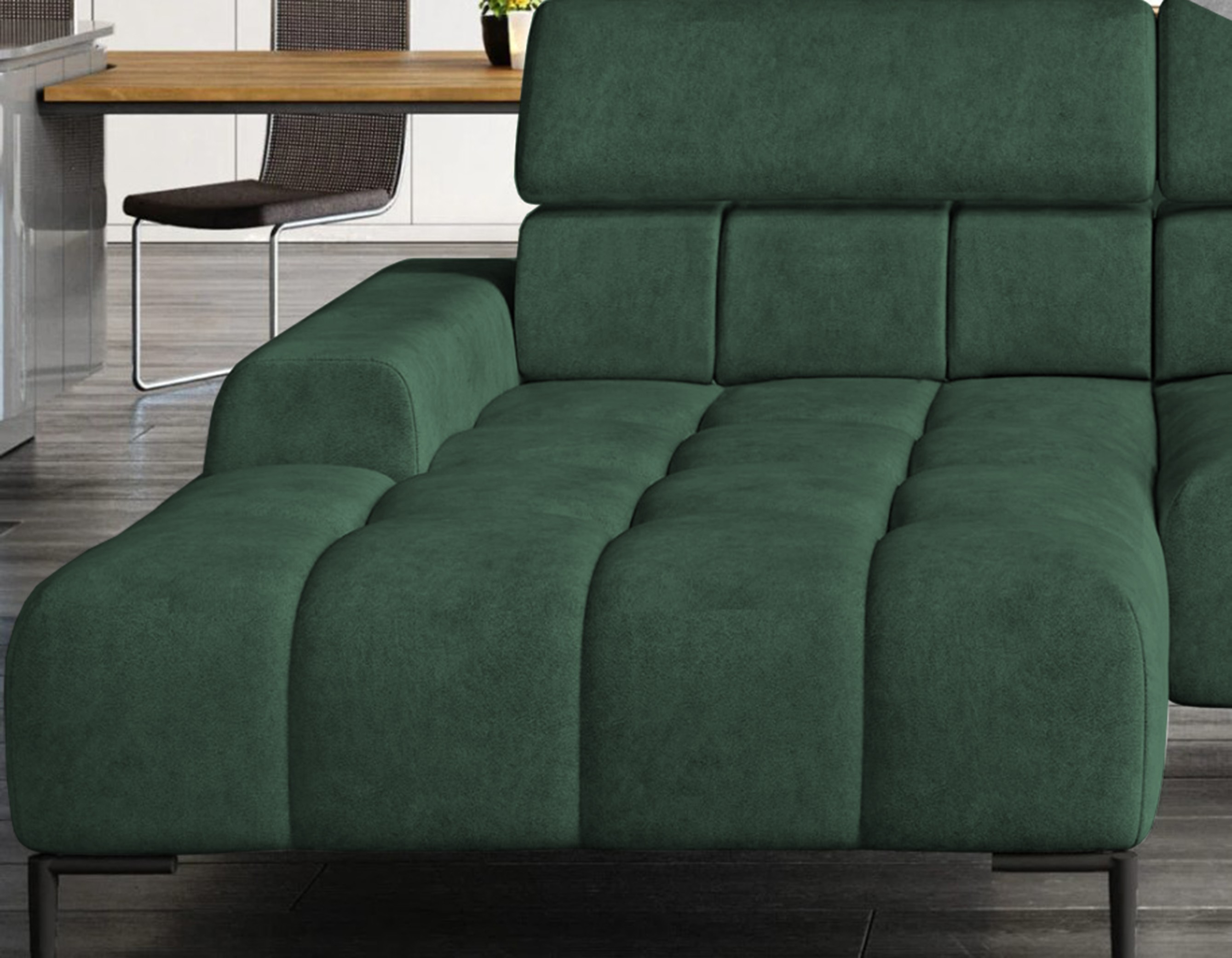 Pikowane siedzisko nadaje narożnikowi nowoczesnego charakteru, a wysokie metalowe nóżki (czarne lub złote) w stylu loftowym dodają mu lekkości i elegancji.