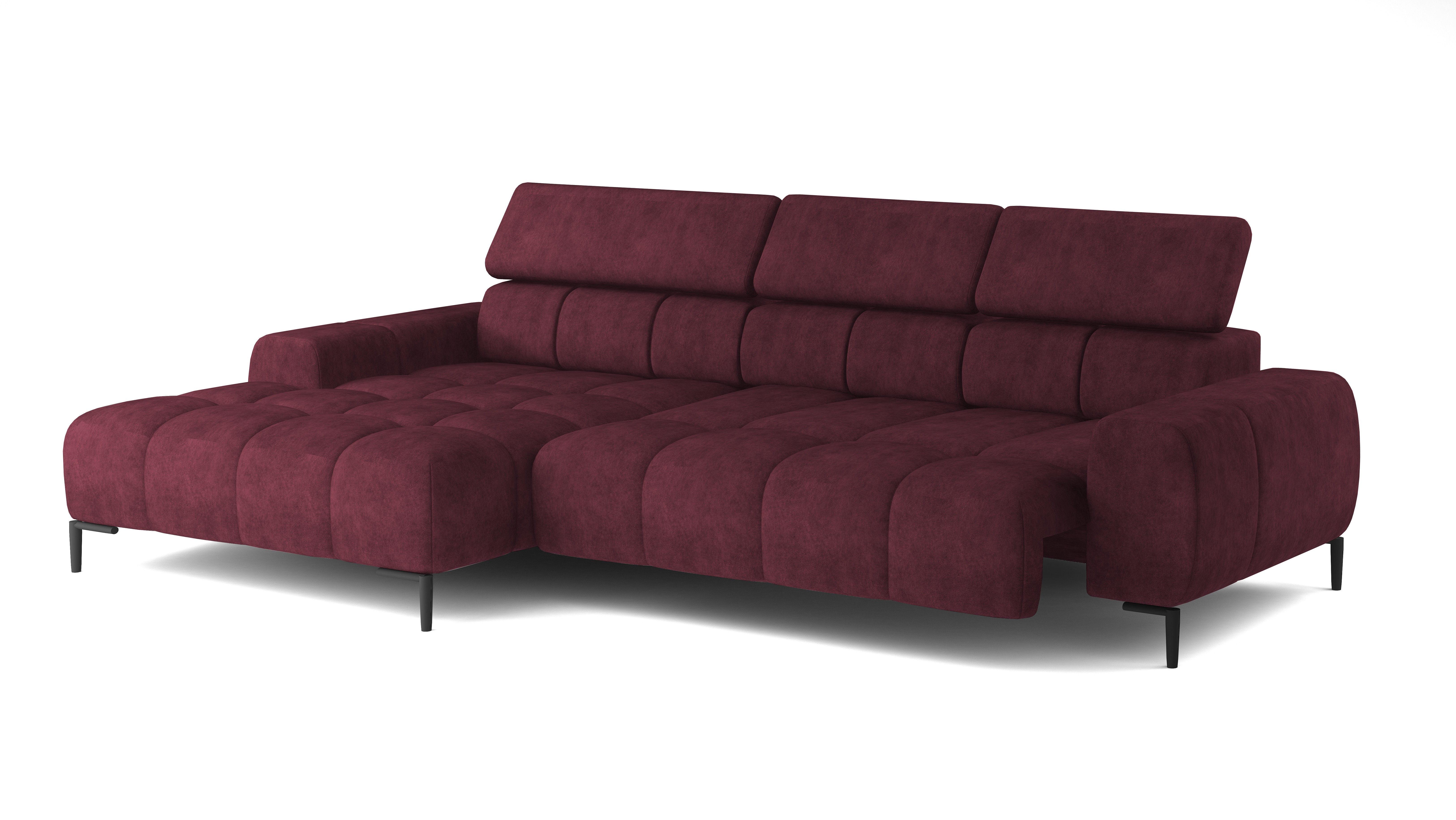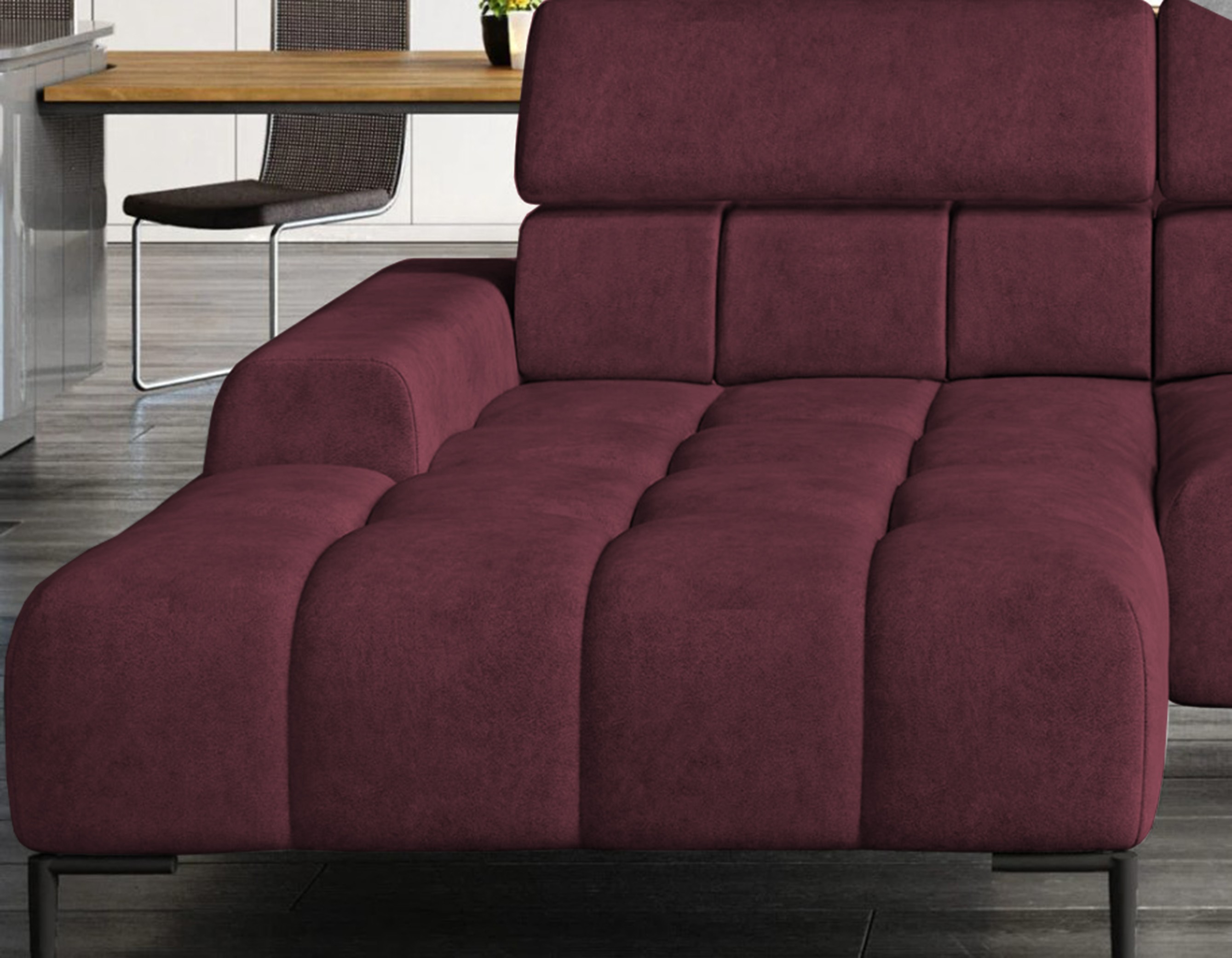 Pikowane siedzisko nadaje narożnikowi nowoczesnego charakteru, a wysokie metalowe nóżki (czarne lub złote) w stylu loftowym dodają mu lekkości i elegancji.