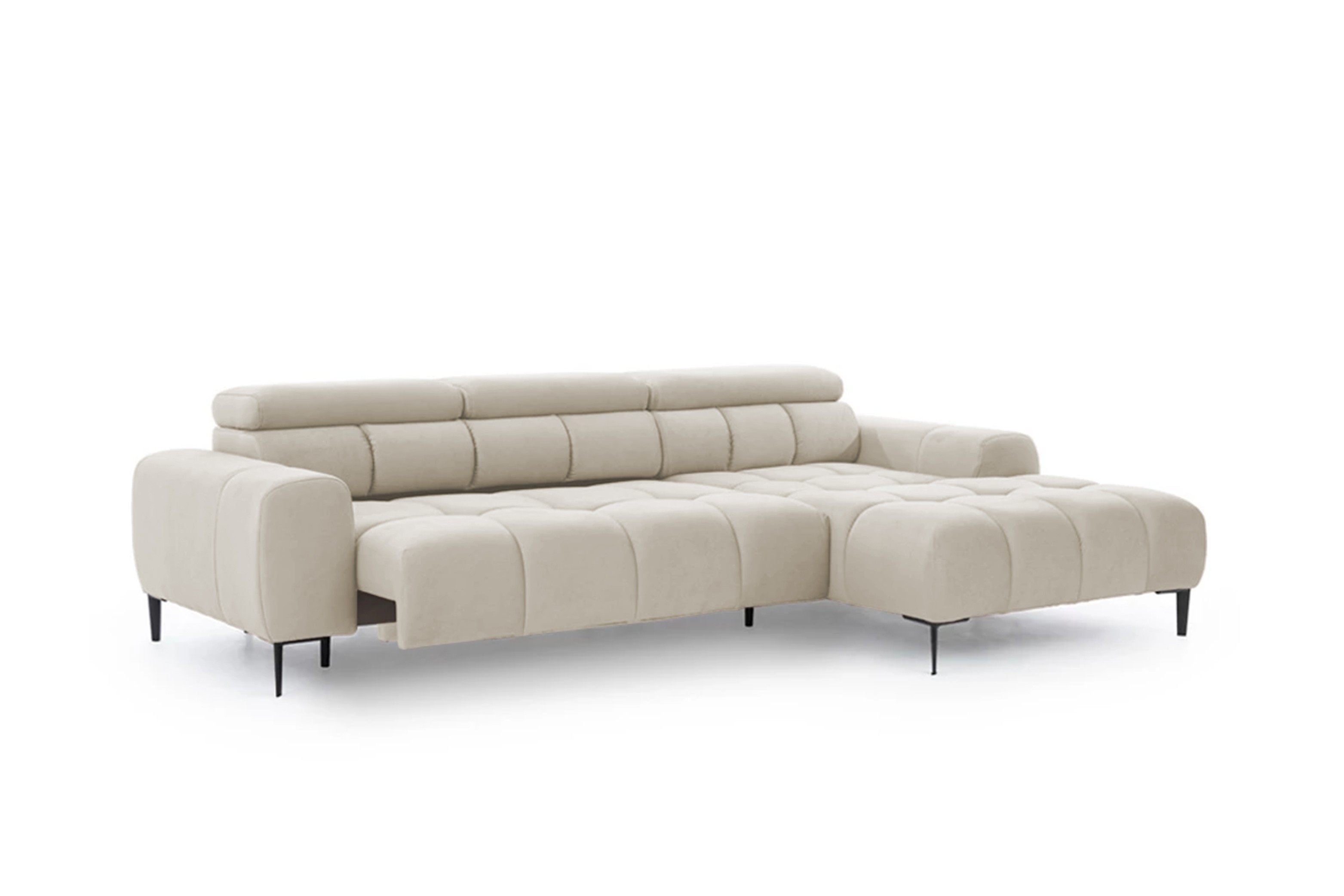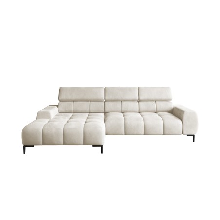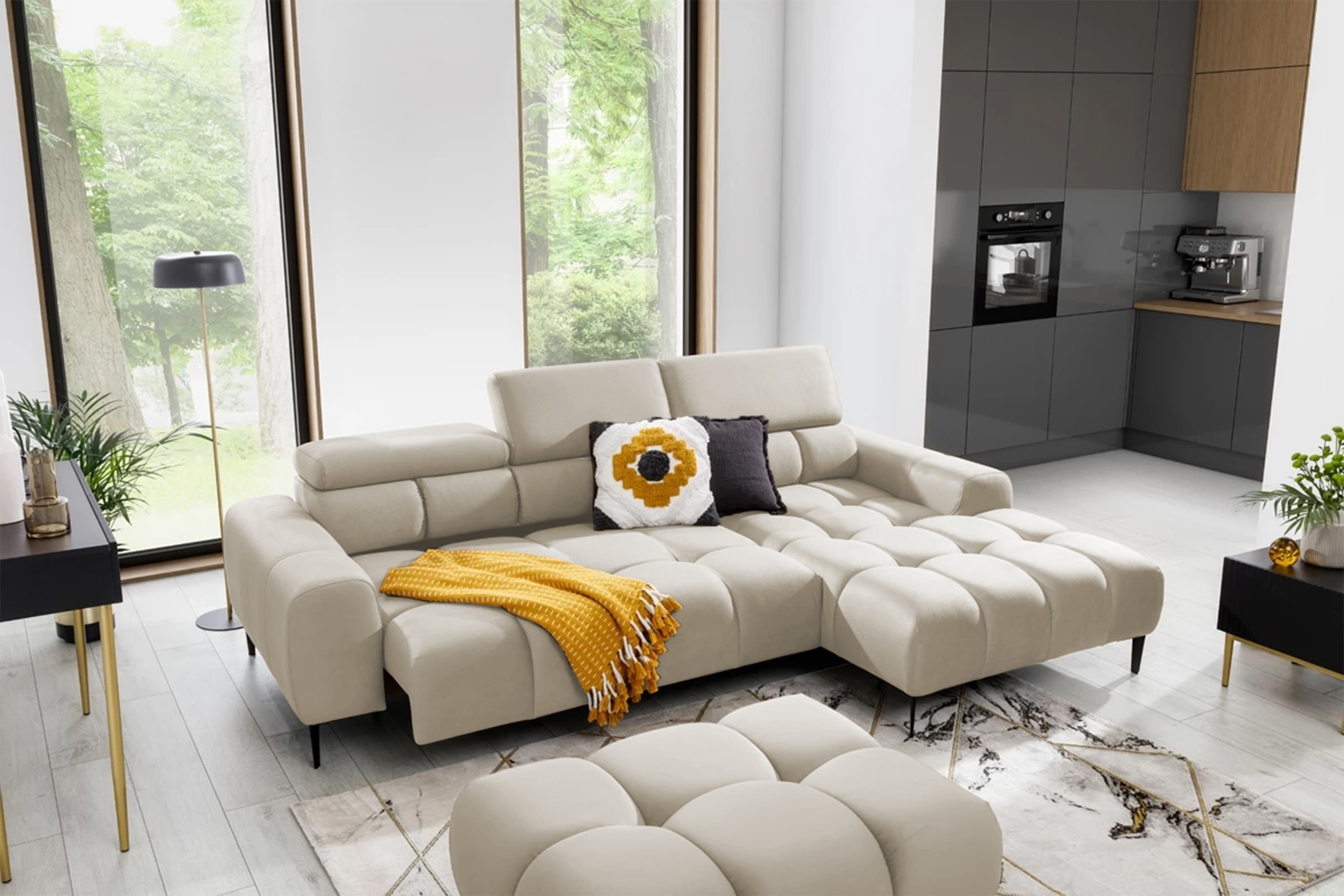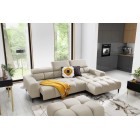 Pikowane siedzisko nadaje narożnikowi nowoczesnego charakteru, a wysokie metalowe nóżki (czarne lub złote) w stylu loftowym dodają mu lekkości i elegancji.