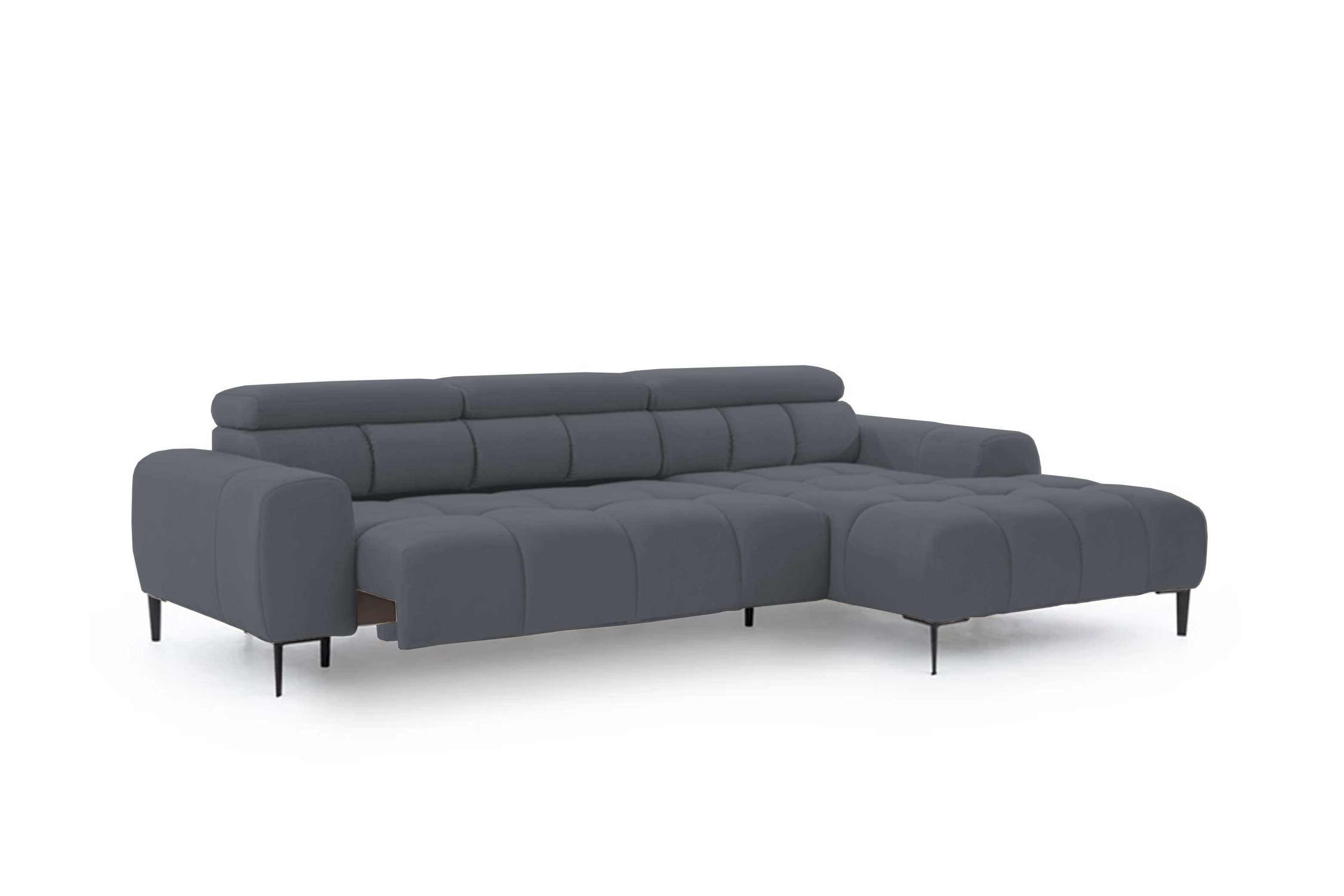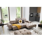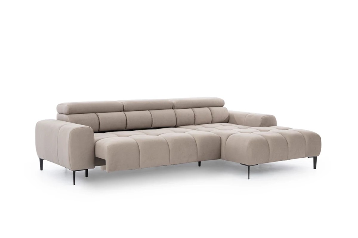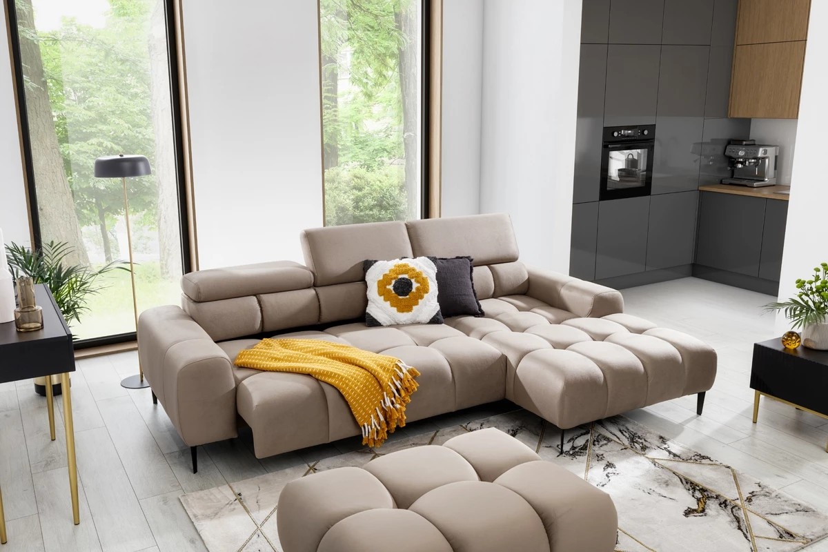 Pikowane siedzisko nadaje narożnikowi nowoczesnego charakteru, a wysokie metalowe nóżki (czarne lub złote) w stylu loftowym dodają mu lekkości i elegancji.