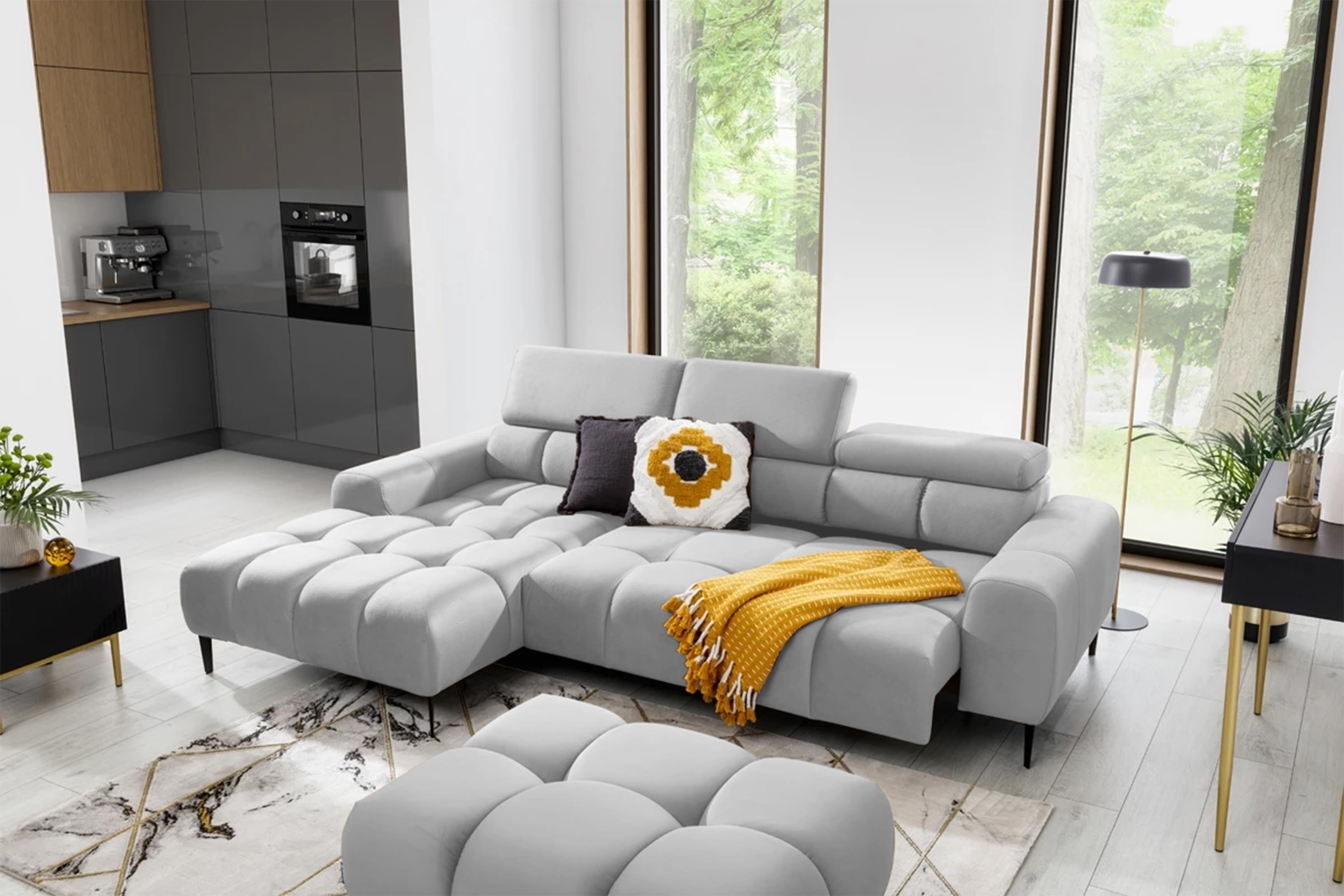 Pikowane siedzisko nadaje narożnikowi nowoczesnego charakteru, a wysokie metalowe nóżki (czarne lub złote) w stylu loftowym dodają mu lekkości i elegancji.