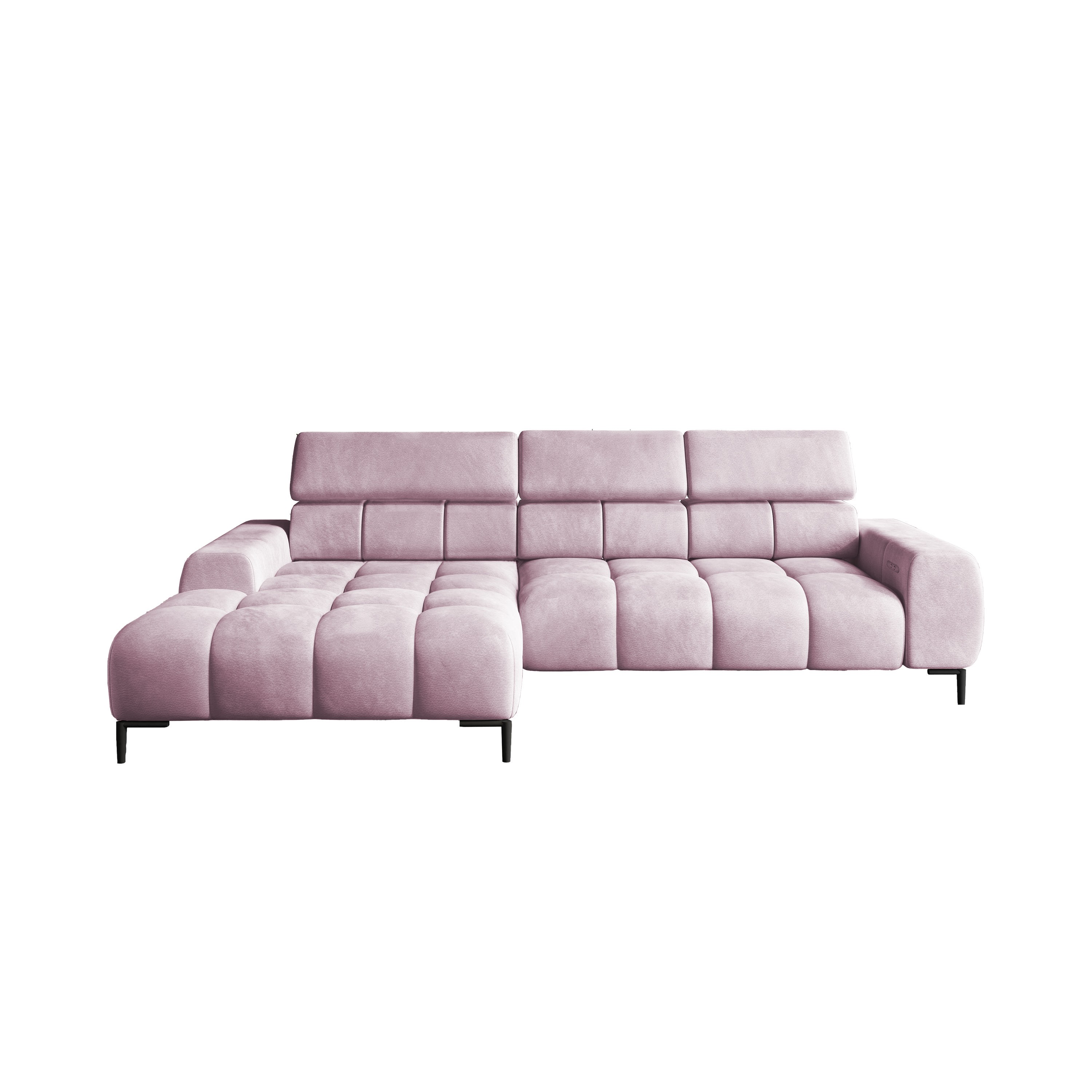 Pikowane siedzisko nadaje narożnikowi nowoczesnego charakteru, a wysokie metalowe nóżki (czarne lub złote) w stylu loftowym dodają mu lekkości i elegancji.