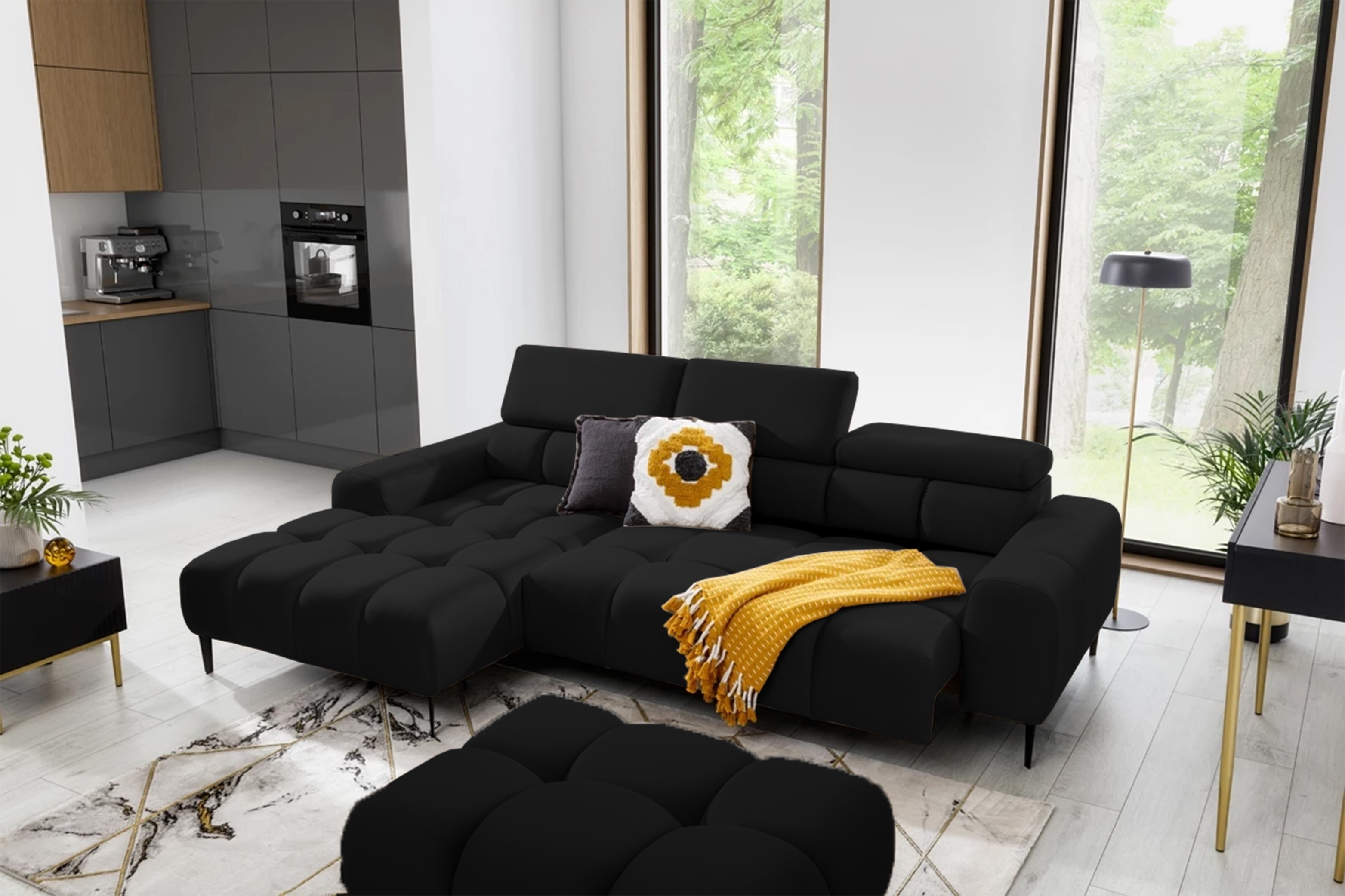 Pikowane siedzisko nadaje narożnikowi nowoczesnego charakteru, a wysokie metalowe nóżki (czarne lub złote) w stylu loftowym dodają mu lekkości i elegancji.
