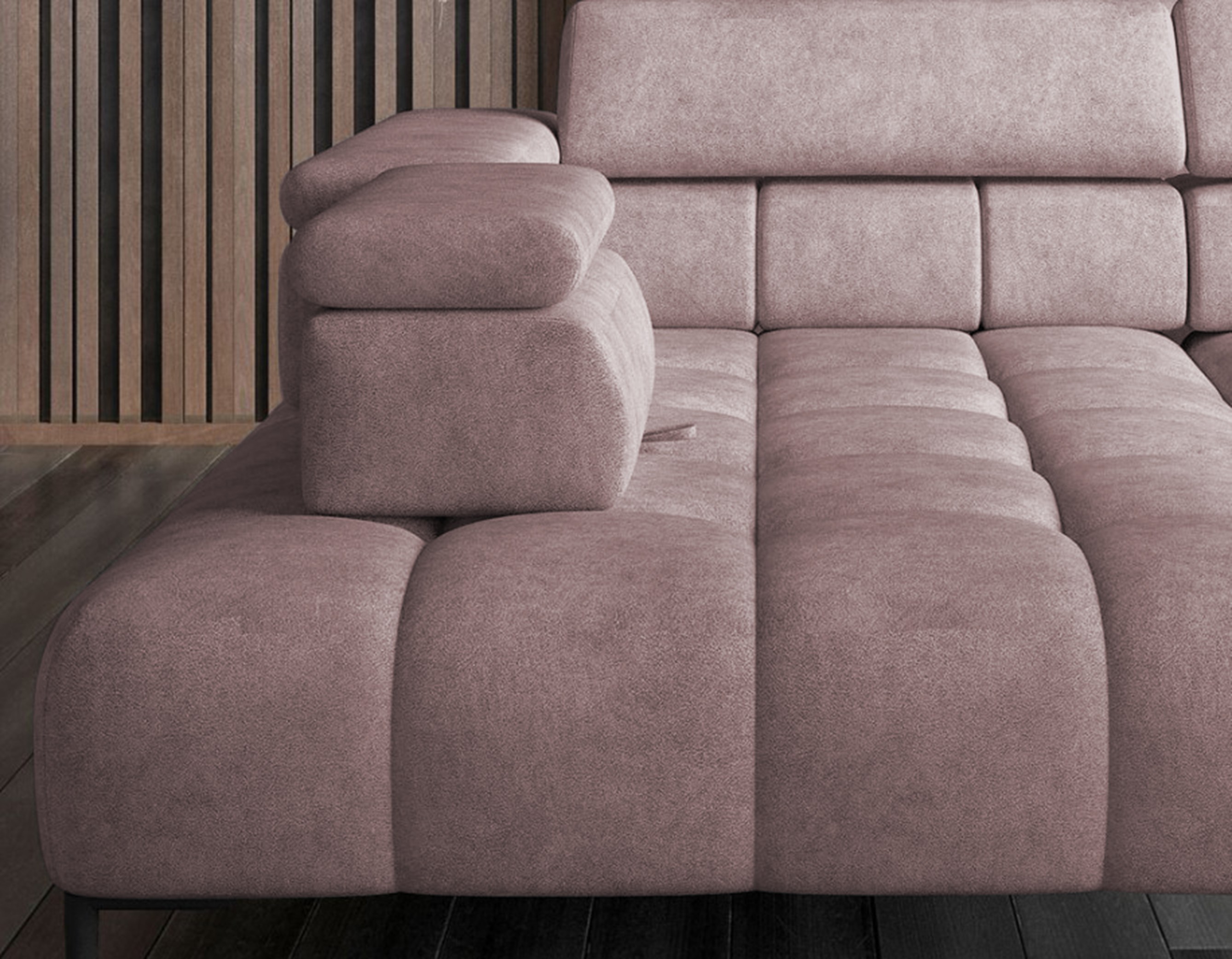 Dodatkowo narożnik wyposażony jest w przesuwne oparcie oraz 6 regulowanych zagłówków z możliwością blokady w dowolnej pozycji.