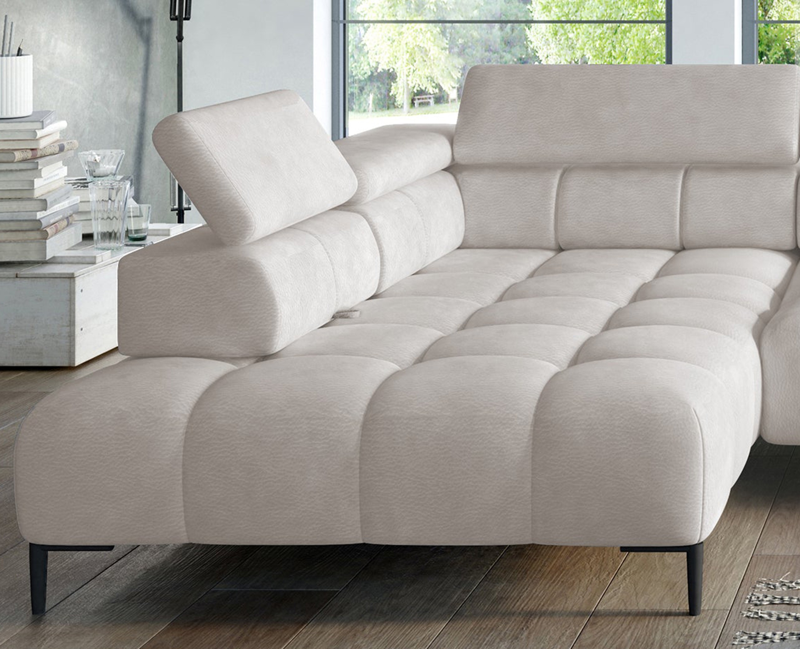 Dodatkowo narożnik wyposażony jest w przesuwne oparcie oraz 6 regulowanych zagłówków z możliwością blokady w dowolnej pozycji.