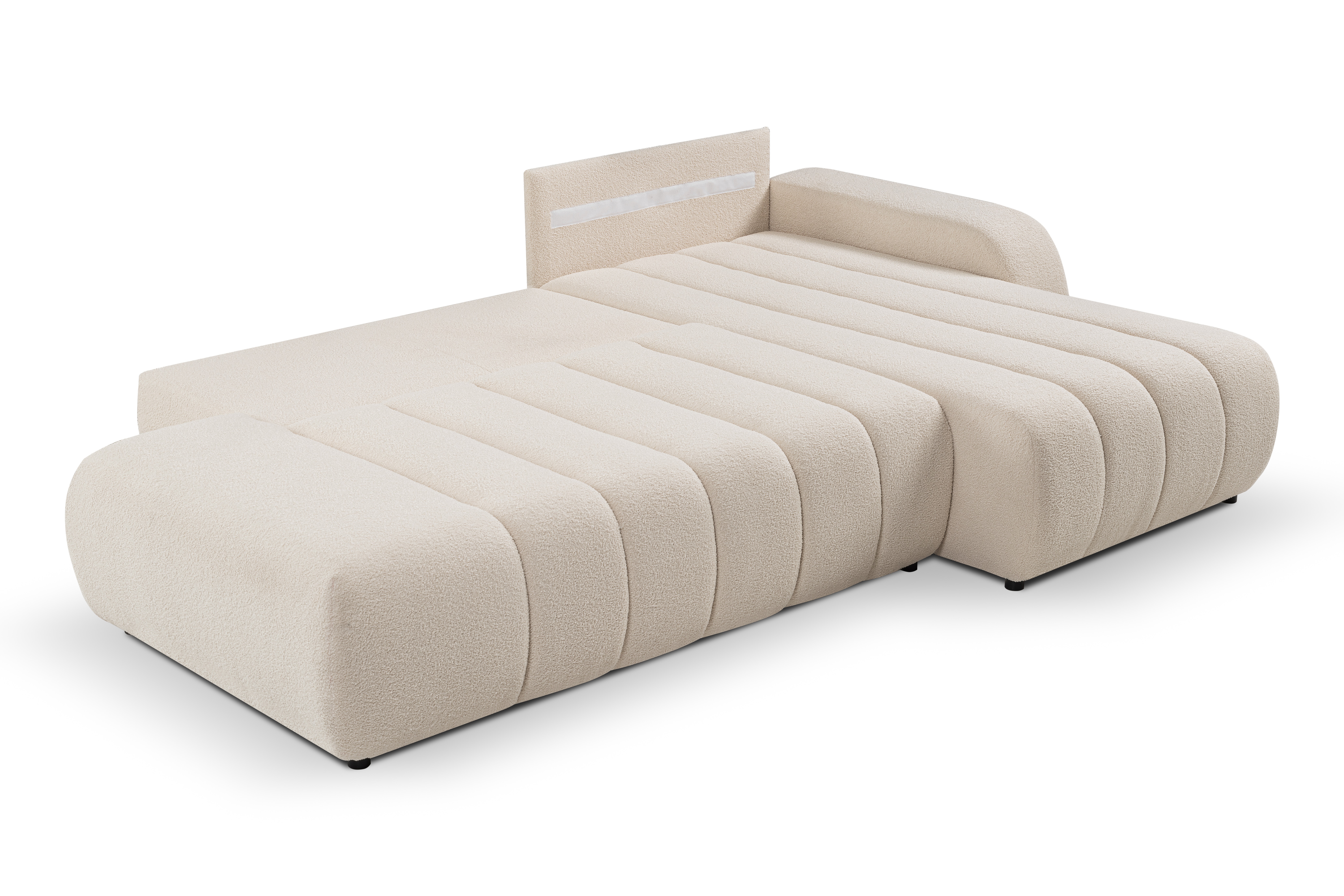 Funkcja spania umożliwia szybkie przekształcenie narożnika w wygodne miejsce do odpoczynku, a pojemnik na pościel pozwala na praktyczne przechowywanie kołder i poduszek.