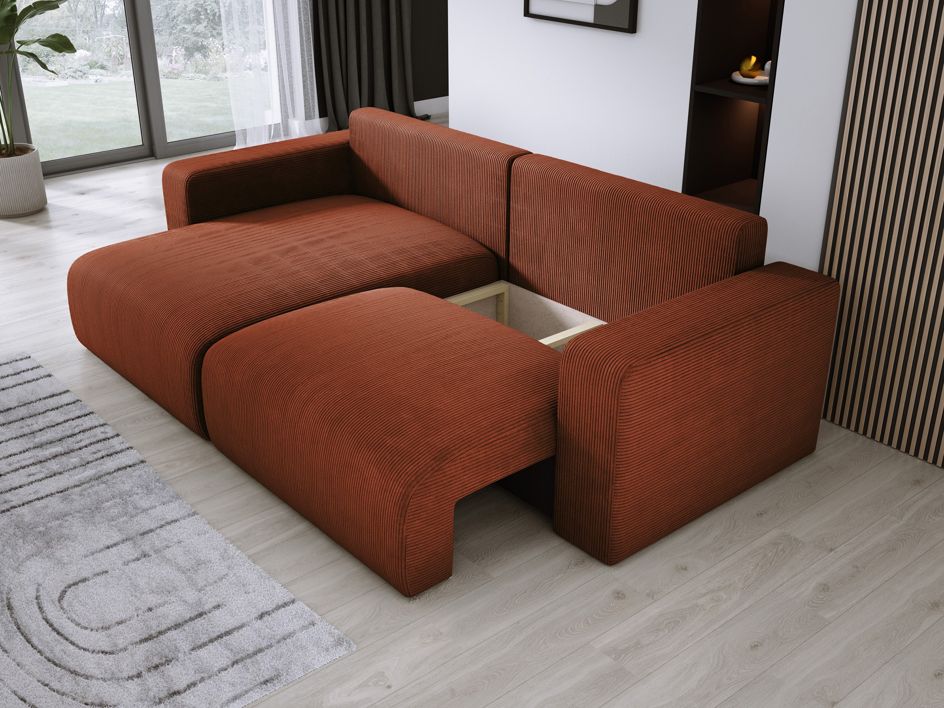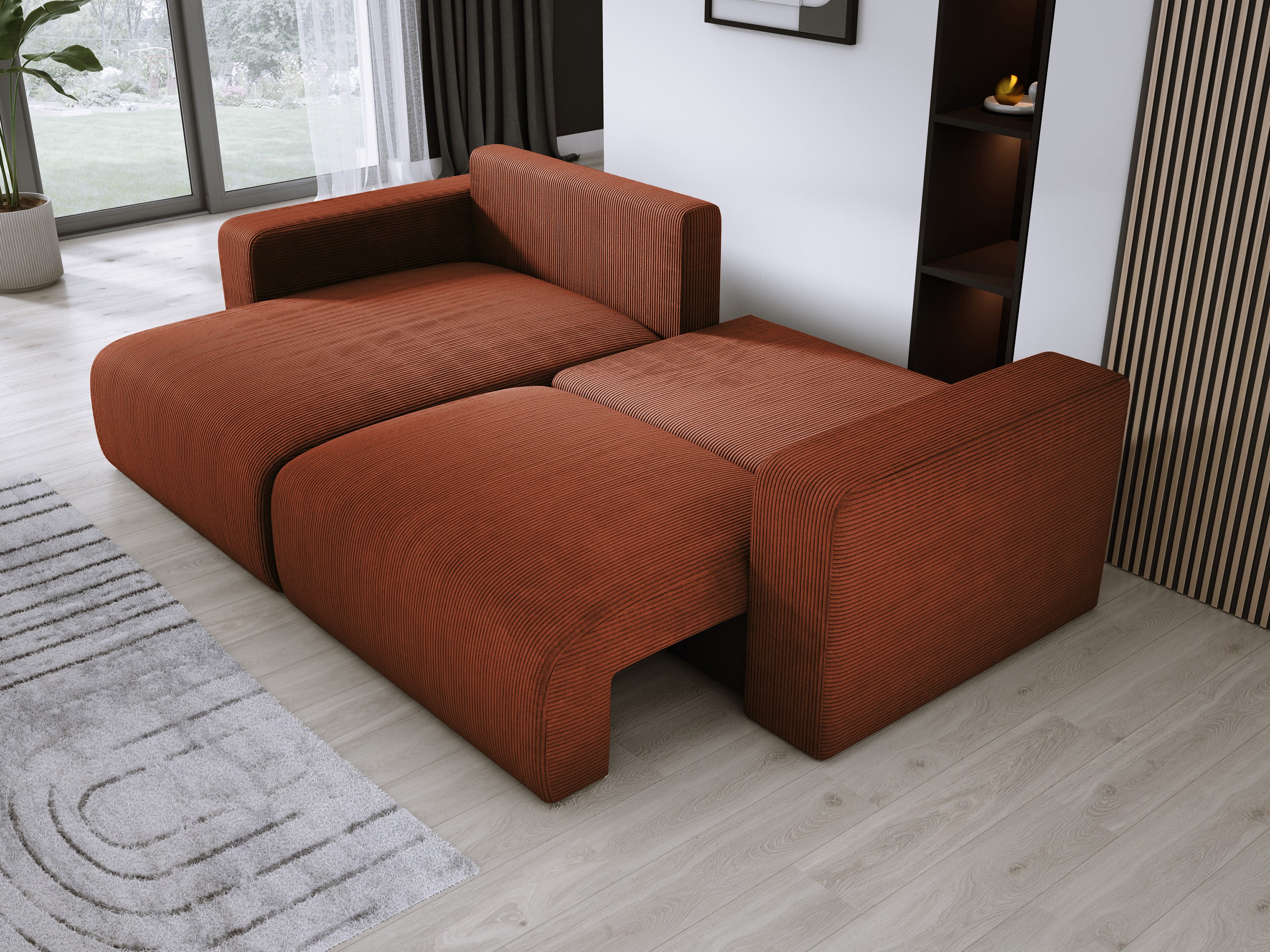 Miękkie poduchy oparciowe i wysokiej jakości obicie sztruksowe dodają mu przytulności i nowoczesnego charakteru.