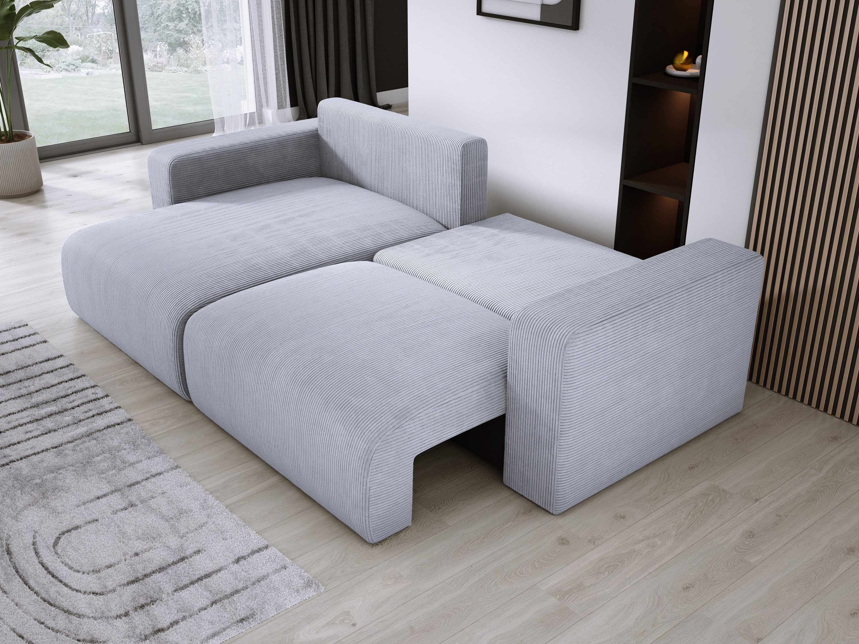 Miękkie poduchy oparciowe i wysokiej jakości obicie sztruksowe dodają mu przytulności i nowoczesnego charakteru.
