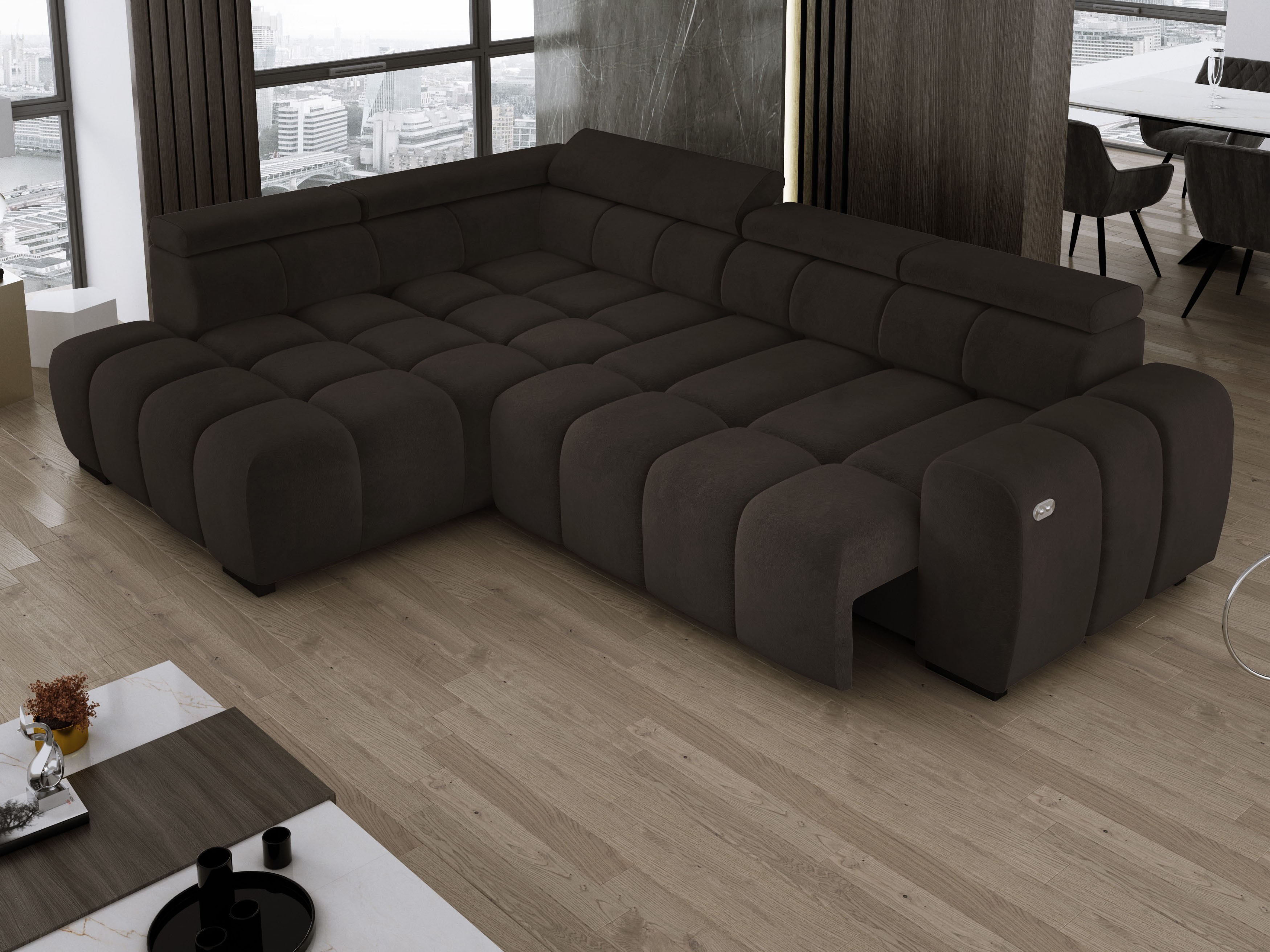 Wyposażony w elektrycznie wysuwane siedzisko (do 27 cm), OMBO oferuje wygodną przestrzeń do wypoczynku oraz praktyczną funkcję spania na co dzień.