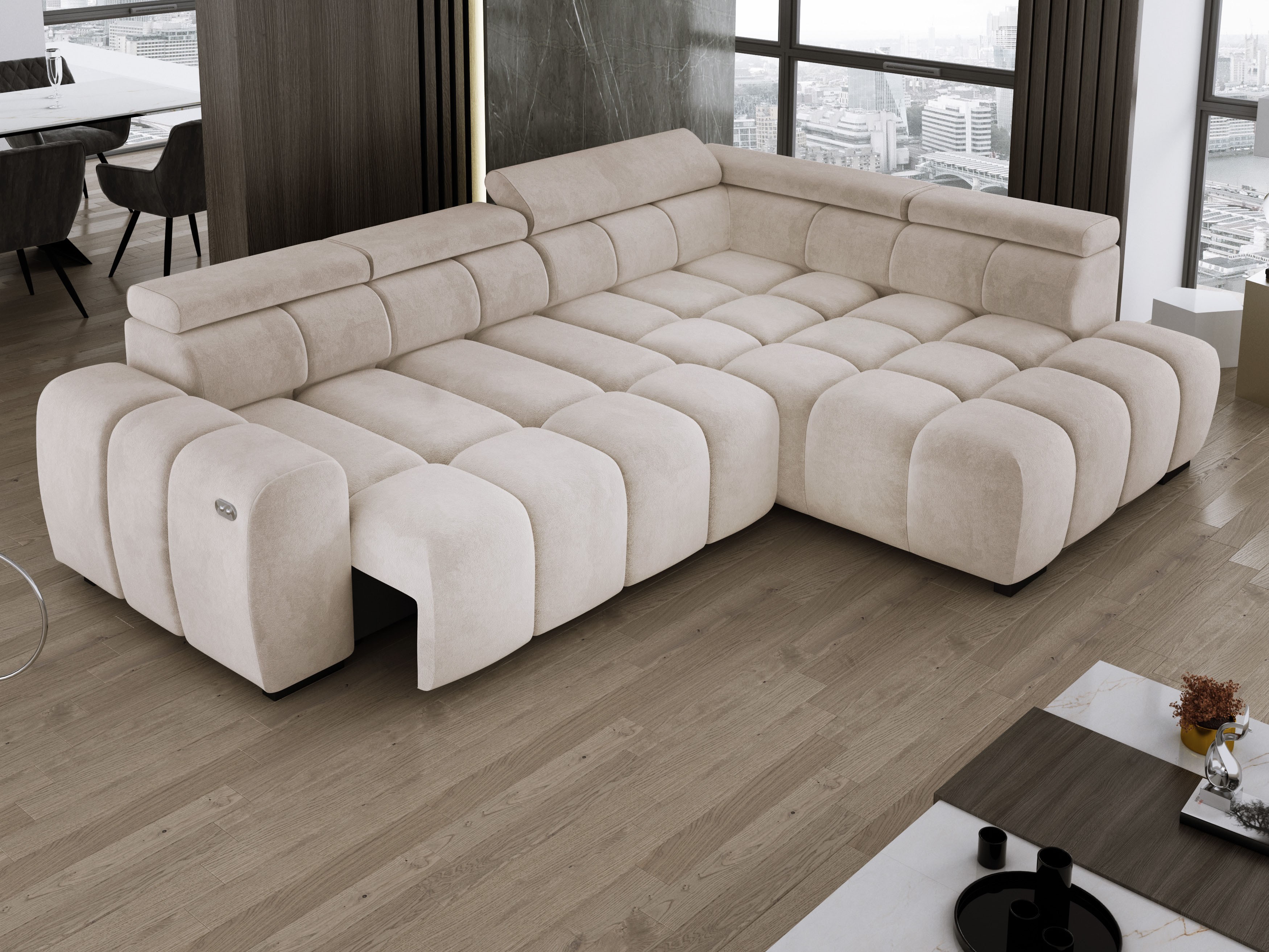 Wyposażony w elektrycznie wysuwane siedzisko (do 27 cm), OMBO oferuje wygodną przestrzeń do wypoczynku oraz praktyczną funkcję spania na co dzień.