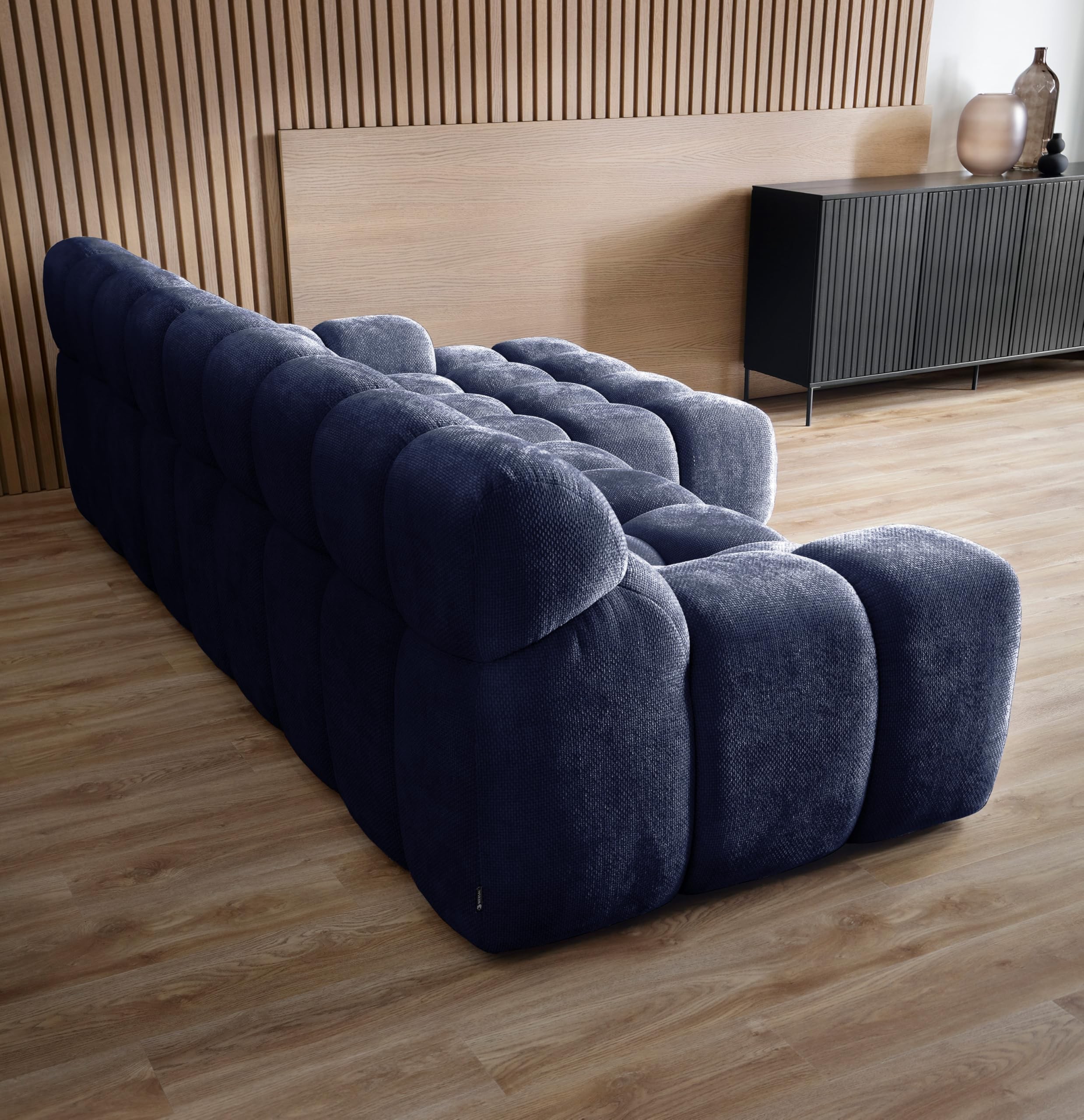 Mebel wolnostojący – tył narożnika CAMPILE obity jest tą samą tkaniną co front, dzięki czemu można go ustawić w dowolnym miejscu w salonie.