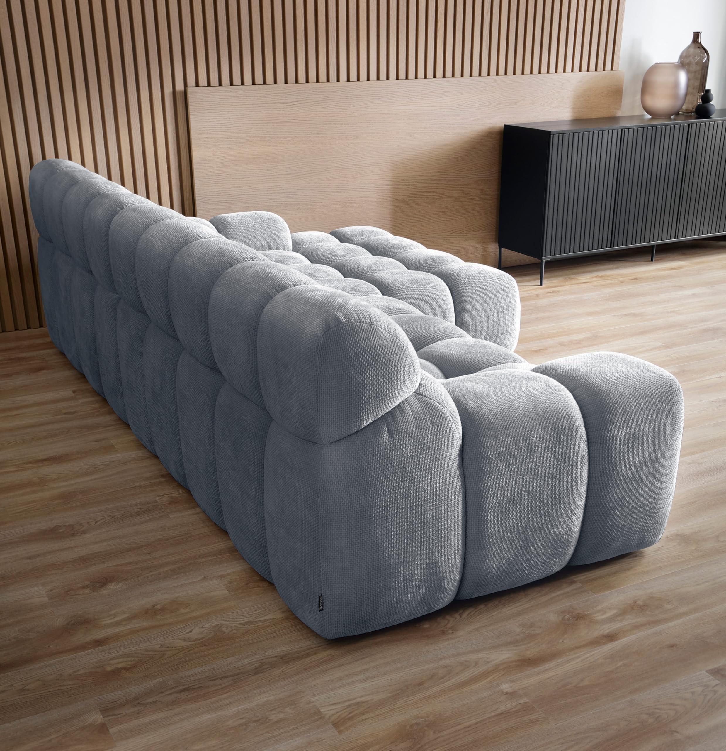 Mebel wolnostojący – tył narożnika CAMPILE obity jest tą samą tkaniną co front, dzięki czemu można go ustawić w dowolnym miejscu w salonie.