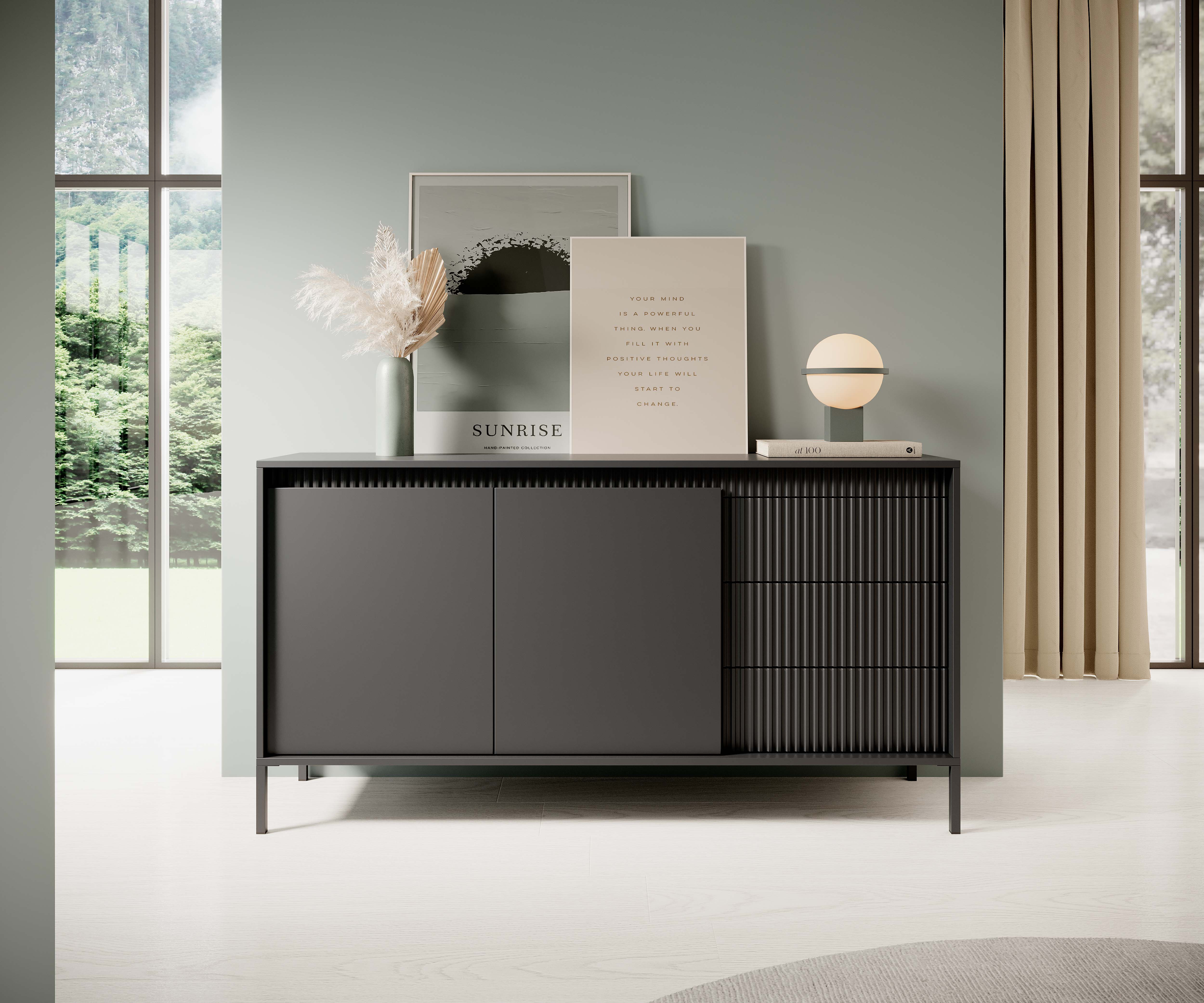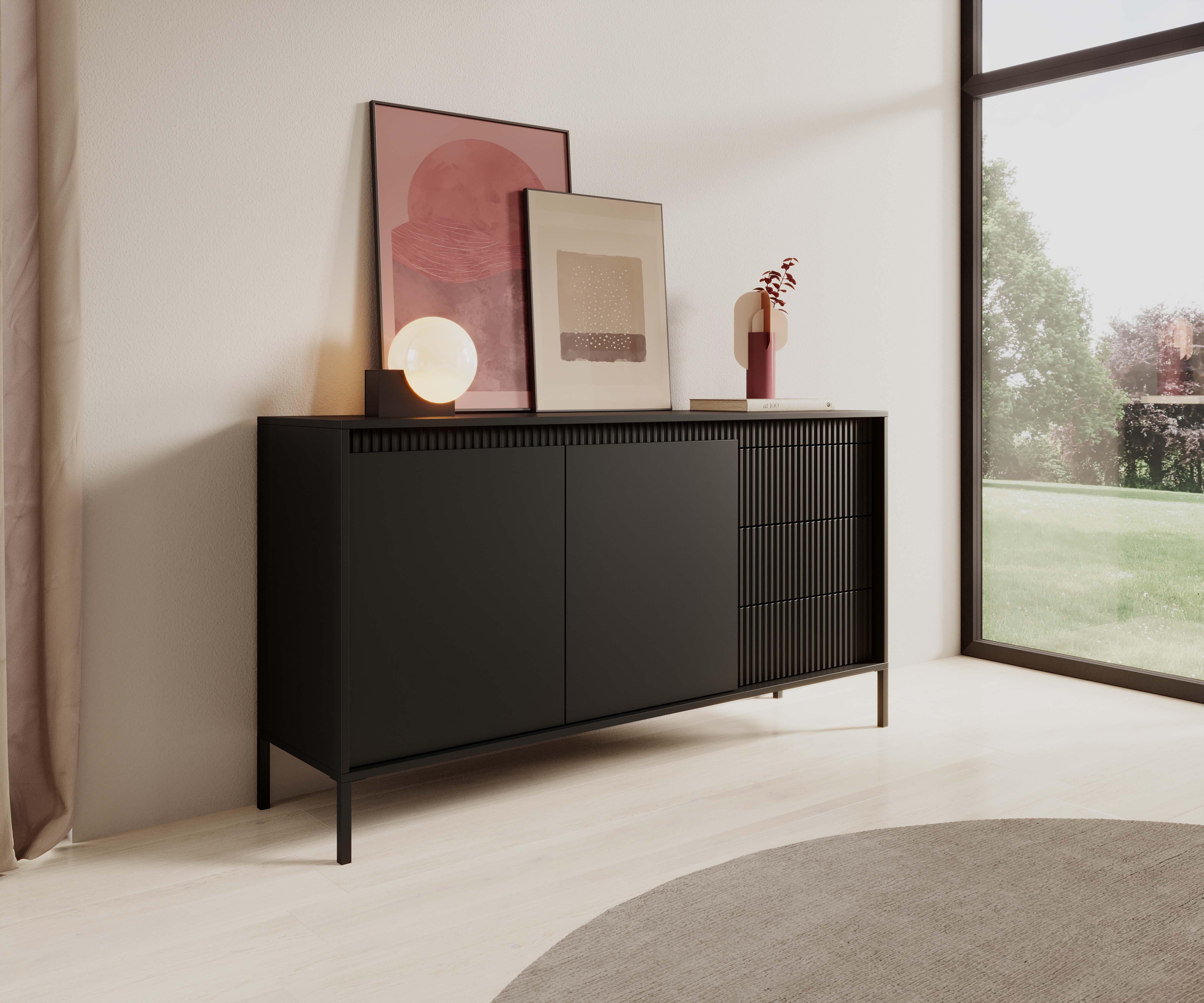 Popularne frazy: komoda czarna, nowoczesne sideboard, ryflowane fronty, komoda bez uchwytów, metalowe nogi, meble do salonu, komoda do sypialni, pojemna komoda