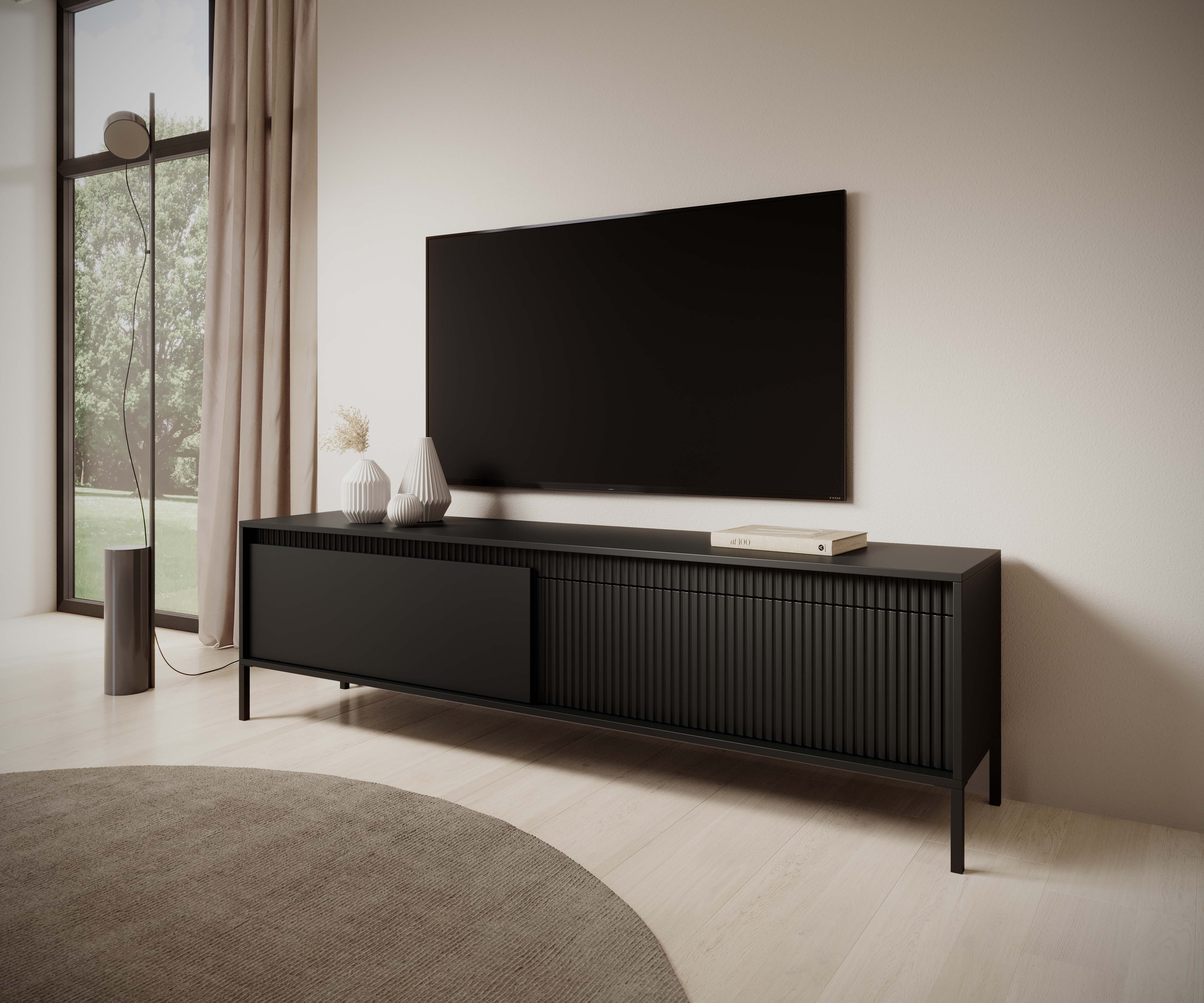 • Nowoczesna szafka RTV w czerni z ryflowanymi frontami MDF