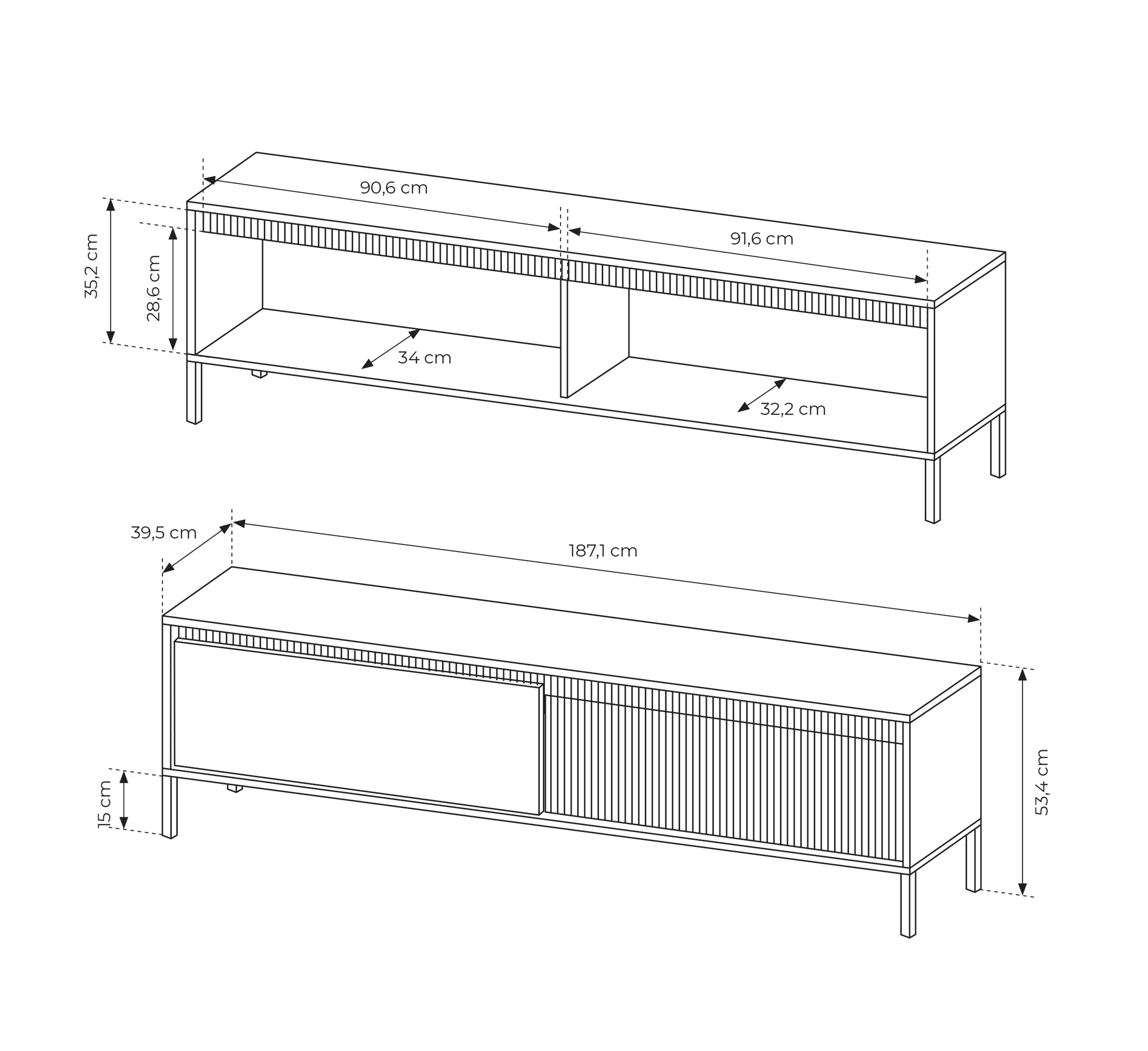 • Wymiary: 187,5 cm szerokości, 53 cm wysokości, 39,5 cm głębokości